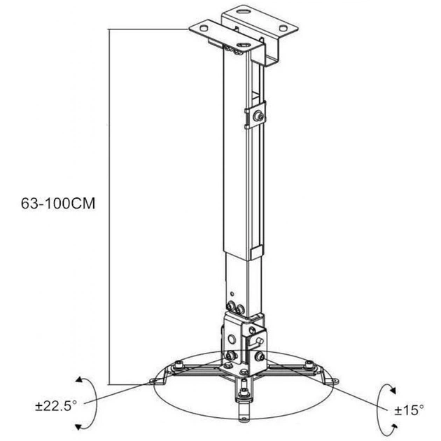 CHARMOUNT PRB63-100 black призначений для проєктора вагою до 20 кг. Кронштейн кріпиться до стелі або до стіни, дає можливість нахилити проєктор від - 15 ° до + 15 ° та регулювати відступ від стелі/стіни в межах 630-1000 мм. Відстінь між адаптерами регулюється від 210 до 280 мм.