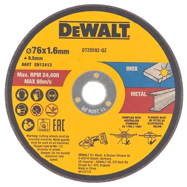 Круг відрізний DeWALT нержавіюча сталь/листовий метал, 76х1, 6х9, 5 мм. 3 шт. (DT20592)