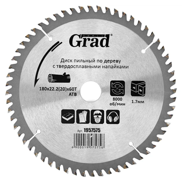 Круг відрізний Grad по дереву з твердосплавними напайками Ø180×22.2(20)×60Т, 8000об/хв (1957575)