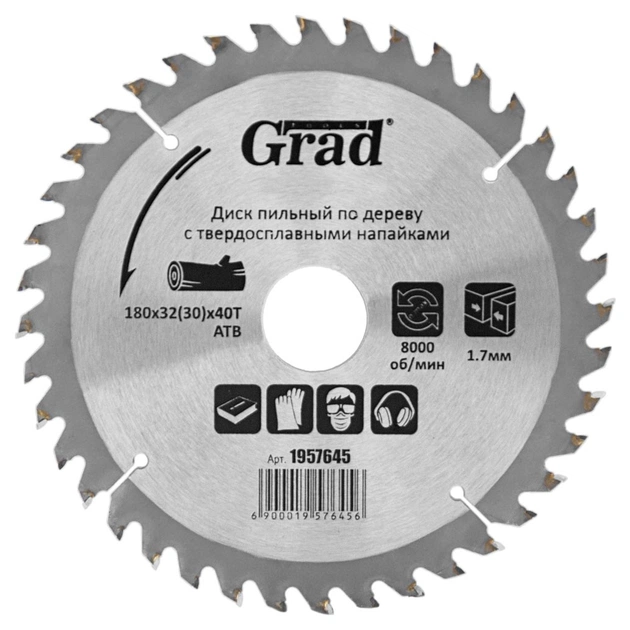 Круг відрізний Grad по дереву з твердосплавними напайками Ø180×32(30)×40Т, 8000об/хв (1957645)