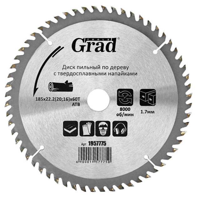 Круг відрізний Grad по дереву з твердосплавними напайками Ø185×22.2(20;16)×60Т, 8000об/хв (1957775)