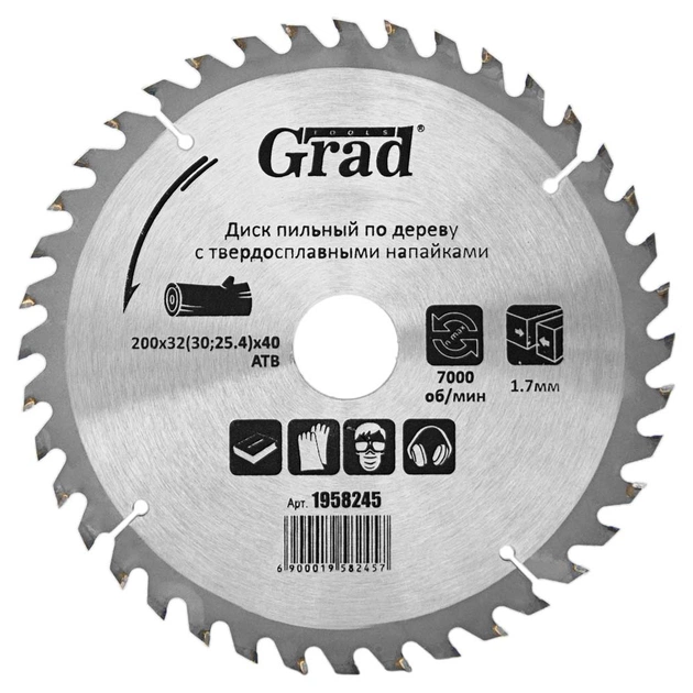 Круг відрізний Grad по дереву з твердосплавними напайками Ø200×32(30;25.4)×40Т, 7000об/хв (1958245)