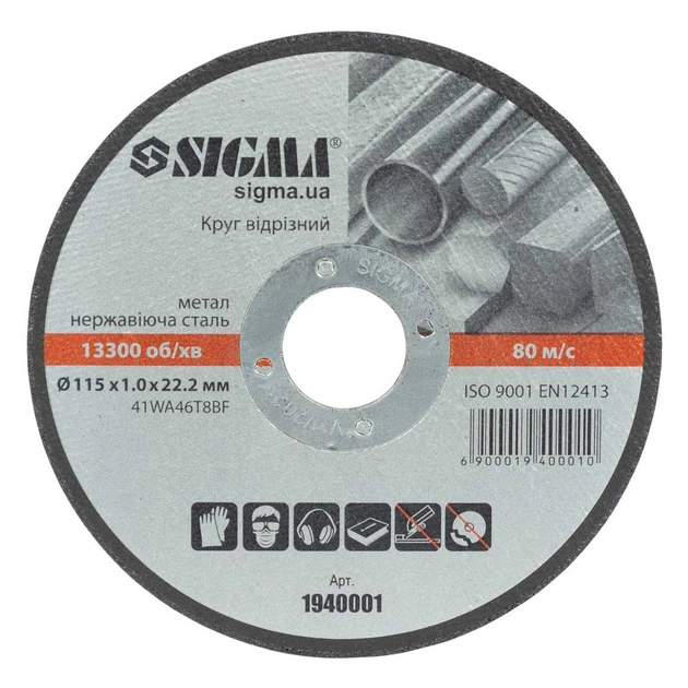 Круг відрізний Sigma по металу та нержавіючій сталі 115x1.0x22.2мм, 13300об/хв (1940001)