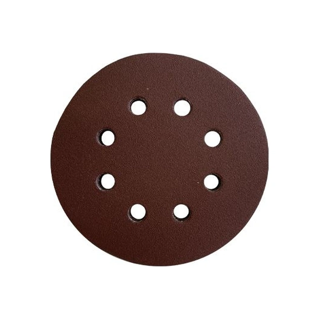 | Шліфувальний диск фіксується на м'якій гумовій основі робочої поверхні платформи за допомогою зручної системи «липучка». Шліфувальний диск з отворами, діаметром 125 мм та зернистістю Р150. Призначений для обробки дерева, фанери, металу, пластмаси, паркету, поверхонь з фарбою, лаком, шпаклівкою, інших матеріалів різної щільності. |