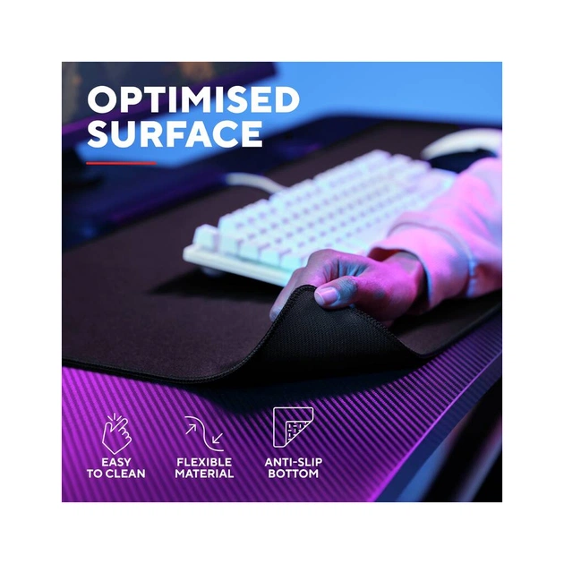 Ігрова поверхня Trust GXT 759 XXL забезпечує комфортну та точну гру. Завдяки розміру 900x400 мм вона вміщує клавіатуру та мишу, а гумова основа запобігає ковзанню. Оптимізована текстура гарантує точність рухів, а прошиті краї захищають від зношування.