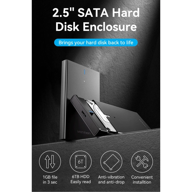 Зовнішня кишеня для 2.5-дюймових HDD/SSD Vention KPAB0 дозволить без інструментів перетворити їх в портативний зовнішній накопичувач. Підключайте зовнішню кишеню з диском до ПК, ноутбука, планшета чи смартфона за допомогою кабелю USB 3.0 A на Micro-B та здійснюйте обмін даними з максимальною швидкістю 5 Гбіт/с. Зовнішня кишеня Vention KPAB0 підтримує прискорені протоколи передачі даних UASP та команду TRIM. Вона автоматично переходить в режим сну через три хвилини спокою, що продовжує термін служби підключених дисків.