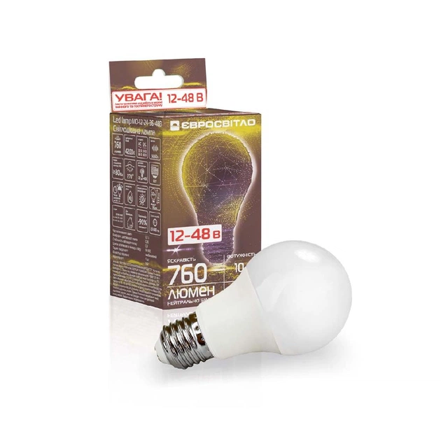 Лампа світлодіодна низьковольтна Євросвітло МО-12-24-36-48В 10 Вт E27. Лампа МО — низьковольтна лампочка, що працює як від змінного, так і від постійного струму з напругою: 12, 24, 36, 48 В.