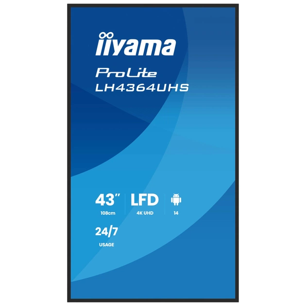 Модель ProLite LH4364UHS-B1AG — це 43-дюймовий 4K UHD дисплей нового покоління, створений для максимально ефективної візуальної комунікації у вашому бізнесі. Оснащений операційною системою Android 14, платформами iiSignage² (CMS), iiControl (DMS) та iiShare (бездротова презентація), він забезпечує просте й інтуїтивне керування контентом. Підтримка Wi-Fi дає змогу оновлювати контент дистанційно, а режим 24/7 гарантує надійну роботу без перерв. Ідеальне рішення для роздрібної торгівлі, офісних просторів, готелів або закладів харчування — цей дисплей поєднує яскравість, гнучкість і привабливий дизайн для максимальної залученості аудиторії.