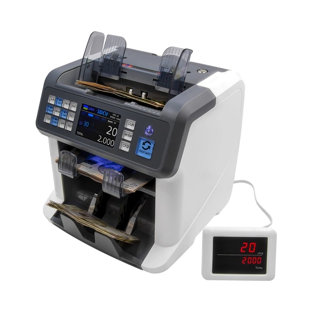 Обладнаний 3.5" РК-дисплеєм преміум-класу. Він забезпечує чітке виведення результатів підрахунку, доступних під різними кутами для оператора. Крім того, при виявленні фальшивих банкнот екран стає червоним і подається звуковий сигнал, гарантуючи, що жодна фальшива купюра не залишиться непоміченою.