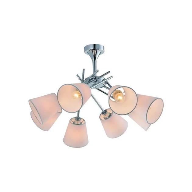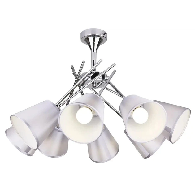 Люстра має текстильний абажур красивого сріблястого кольору, що надає їй розкішного та вишуканого вигляду. Абажур підтримується металевою основою, яка має хромоване покриття, що додає блиску і гламуру загальному дизайну.