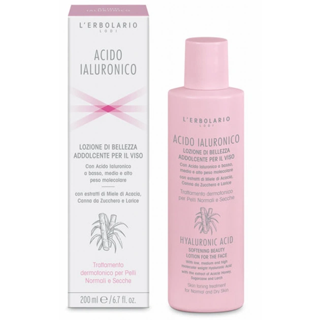 Вся м'якість цього безалкогольного Лосьйону перетворює простий щоденний ритуал очищення на ефективне відновлювальне лікування. Чудовий зволожувальний внесок вносить Гіалуронова кислота з низькою, середньою і високою молекулярною вагою в поєднанні з живильними властивостями екстракту Цукрової тростини, пом'якшувальними властивостями Меду з Акації й освіжними Дистильованої води Волошки: шкіра має вигляд більш м'якої, тонізованої та приємно ущільненої.