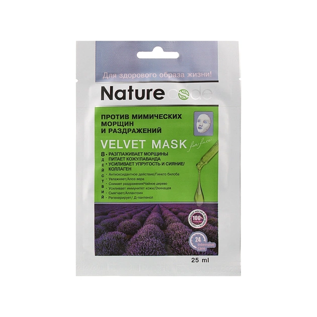 Маска бренда Nature Code — потужний продукт, який чинить антивікову дію. Вона розроблена на основі восьми інгредієнтів з ефективною дією, і серед них містяться ефірні і натуральні олії, рослинні екстракти, алантоїн, Д-пантенол. Завдяки спільному впливу компонентів засіб забезпечує живлення, розгладження, пом’якшення, омолодження, зміцнення тургору і відновлення яскравості обличчя. Продукт має лекало, виготовлене з найтоншого полотна й оснащене анатомічними вирізами.