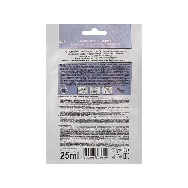 Ретельно очистіть і просушіть шкіру обличчя. Вийміть маску з упаковки і нанесіть її на обличчя, акуратно розрівнюючи кінчиками пальців. Витримайте маску на шкірі протягом 10-15 хвилин, а потім змініть її. Залишки емульсії вмасажуйте в шкіру. Не змивайте. Не використовуйте маску двічі! Використовуйте 1-2 рази на тиждень. Перед використанням протестувати на невеликій ділянці шкіри, а у випадку виникнення алергічних реакцій припинити використання. Можуть виникати алергічні реакції на окремі компоненти продукту.