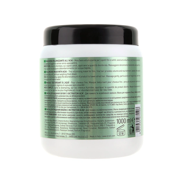 Торгова марка Brelil представляє вашій увазі універсальну маску для надання об'єму з екстрактом асаї. Екстракт цих ягід має багато корисних властивостей і відновлює структуру волосся. Маска глибоко проникає в шкіру голови і живить волосяні цибулини. Засіб надає волоссю неймовірного об’єму і робить його шовковистим і блискучим.