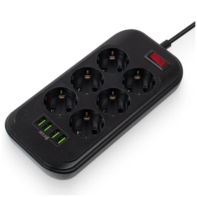 Подовжувач, з шістьма мережевими розетками 220В і 4 USB портами 17 Вт. З його допомогою можна підключати не лише електроприлади, але і одночасно заряджати до 4-х мобільних пристроїв. Провід 2 метра з чистої міді витримує навантаження до до 2500 Вт.