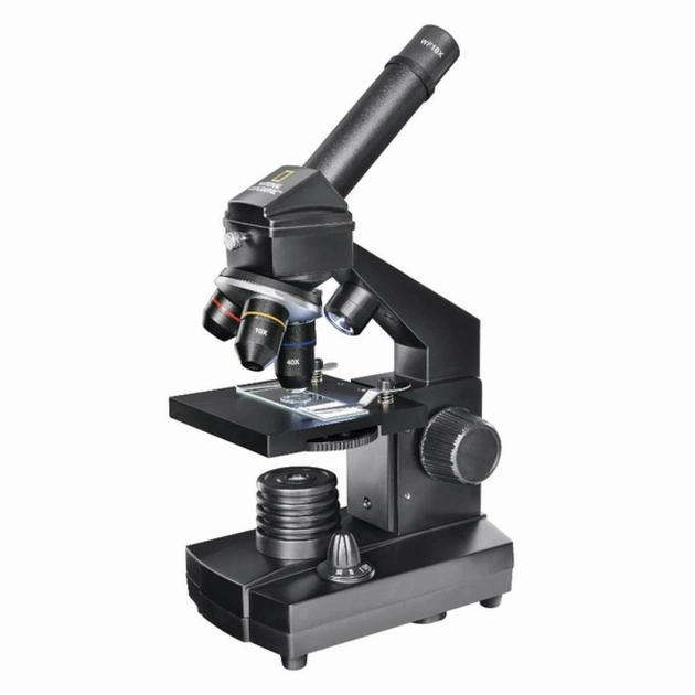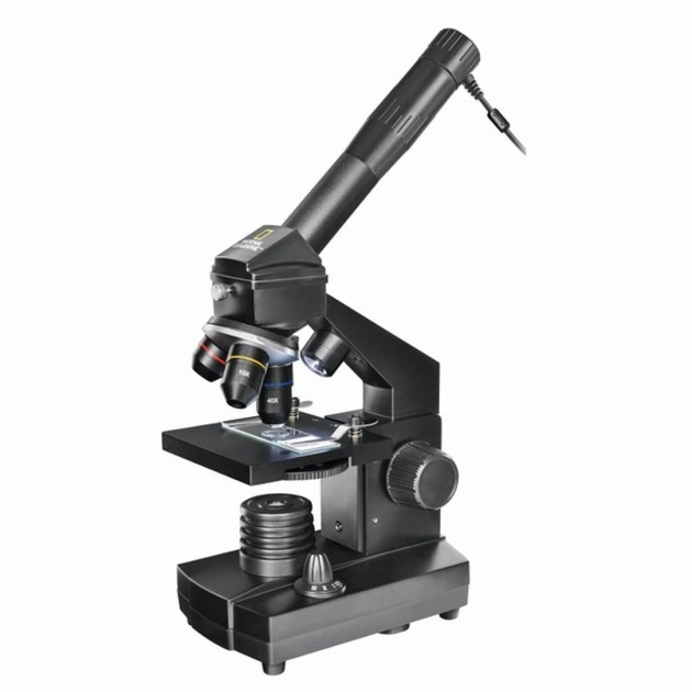 Мікроскоп National Geographic 40x-1024x USB добре укомплектована модель недорогого навчального мікроскопа, забезпечена пластиковим кейсом, широким набором аксесуарів, а також PC-мікроокуляром (цифровою камерою), який забезпечить комфортне спостереження зразків безпосередньо з екрану монітора. Разом з тим прилад укомплектований якісною скляною мультипросвітленою оптикою, що робить його цікавим не тільки дітям та підліткам, а й дорослим.