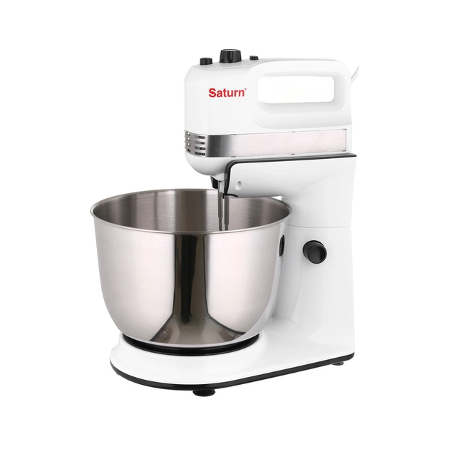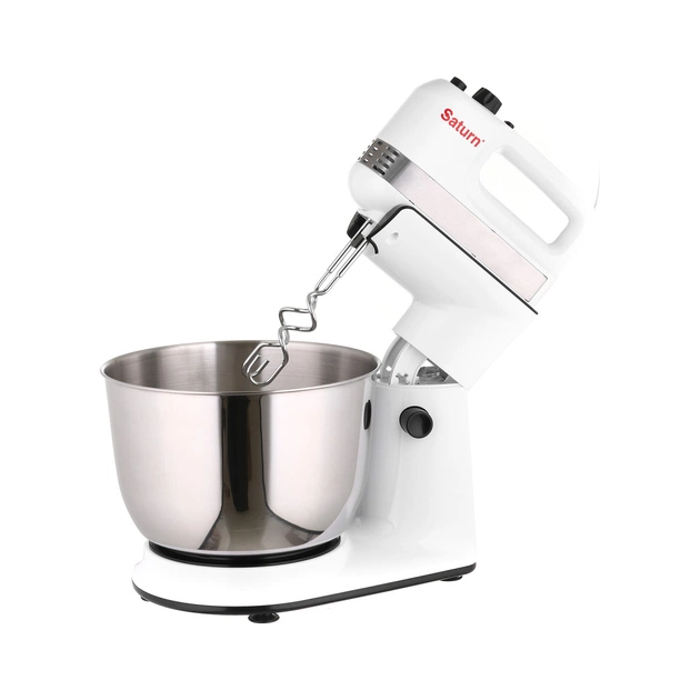 Стаціонарний міксер, потужність 300 Вт, 12 швидкостей, турбо режим, чаша з нерж. сталі – 4 л, обертання чаші, віночки для збивання, гаки для тесту, кнопка від'єднання насадок.