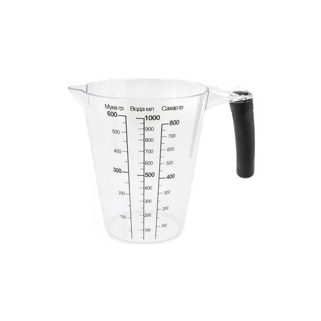 Матеріал – харчовий пластик. Об'єм: 1 л. Діаметр: 18 см. Висота: 15 см. На склянці нанесено мірну шкалу. Використовується для вимірювання рідини, а також сипучих. Має зручний носик для зливу. Можна мити в посудомийній машині. Потрібна річ на будь-якій кухні.