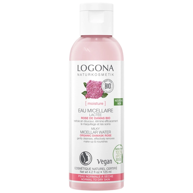 Ніжне очищення шкіри від макіяжу й інтенсивне зволоження! Міцелярна вода Logona гарно видаляє забруднення, водночас зволожує епідерміс, не викликаючи подразнень і відчуття стягненості. Зняти макіяж або просто освіжити обличчя впродовж дня — цей засіб підійде в будь-якому випадку, а приємний аромат пелюсток троянди подарує відчуття гармонії та спокою. Троянда чинить тонізувальний ефект на шкіру, відновлює її еластичність, ефективно підтягуючи та сприяючи омолодженню клітин епідермісу. Алое додатково насичує клітини вологою, активізуючи кровообіг. Олія виноградних кісточок запобігає появі вікових пігментних плям. Мигдальна олія заспокоює шкіру, усуваючи почервоніння й запалення. Збережіть шовковистість своєї шкіри, нормалізуйте роботу сальних залоз, наповніть епідерміс живильною вологою за допомогою міцелярної води Logona Naturkosmetik.