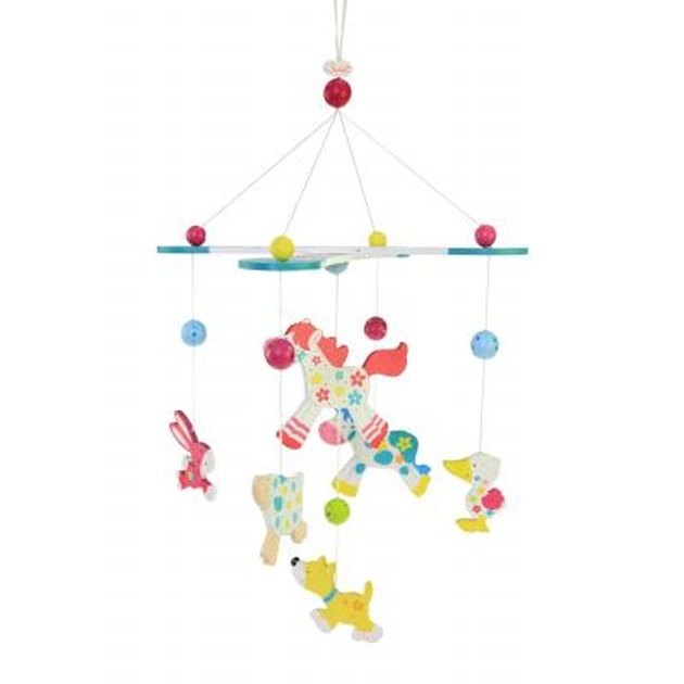 Красиві мобілі Goki Susibelle Звірятка" в стилі кумедних звірят зроблені із якісного, екологічно чистого дерева і пофарбовані в спокійні кольори.