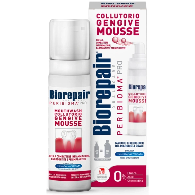 Це унікальне поєднання зубної пасти та ополіскувача для найкращого догляду за ротовою порожниною у зручному форматі. Мус ідеально підходить для профілактики та лікування ясен та слизової (гінгівіт, пародонтит, пародонтоз, стоматит та ін.). Запатентована формула містить: унікальний комплекс microRepairBIOMA з відновлюючими емаль наночастинками гідроксиапатиту (18%) та збагачена інноваційними пробіотиками. Також, містить «Детокс комплекс», що складається з вітамінів А, С, Е , гамамелісу та гіалуронової кислоти. «Протизапальний комплекс» з всесвітньо відомою Хіоською мастикою, натуральні витяжки спіруліни, календули, евкаліпту та натуральним компонентом Цинк РСА.