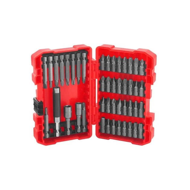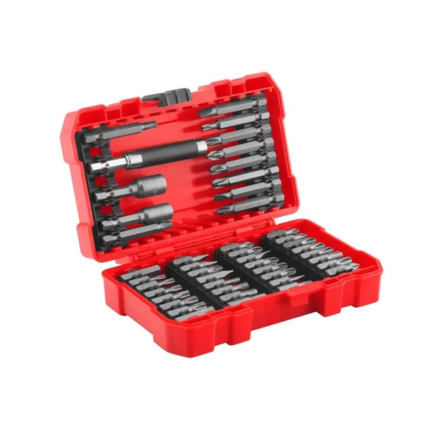 Насадки і торцеві голівкиВисокоміцні магнітні насадки із сталі S2 і торцеві голівки із хром-ванадієвої сталі мають нікелеве покриття. В комплекті є насадки з плоскими, хрестовими (Phillips, Pozi), Torx, Torx-Proof і шестигранними наконечниками різних розмірів. Десять типів 50-міліметрових насадок, два типи 48-міліметрових торцевих голівок і 32 типи 25-міліметрових насадок. Наконечники насадок і торцевих голівок виготовлені із загартованих високоміцних матеріалів, а розмір адаптера становить 25 мм.