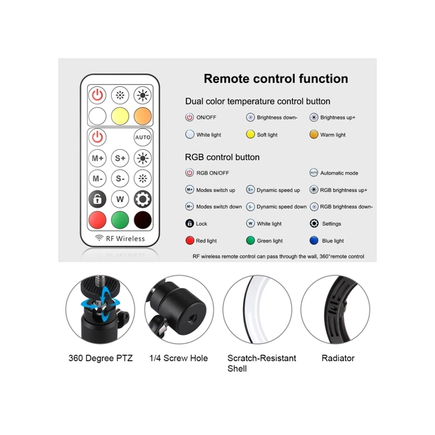 1. Світлодіодний кільцевий світильник можна встановити на тримач і взяти з собою куди завгодно, його також можна зняти зі стійки в будь-який час, кульова головка штатива може обертатися на 360 градусів і може вільно регулюватися під будь-яким кутом (тримач не входить в комплект).
