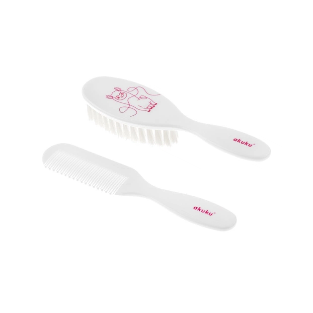 Безпечна, ніжна щітка, призначена для розчісування волосся дитини, виготовлена з нейлонової щетини. М'яко масажує головку дитини та не створює статичної електрики для волосся. Гребінець із закругленими зубчиками не дратує ніжну шкіру малюка.