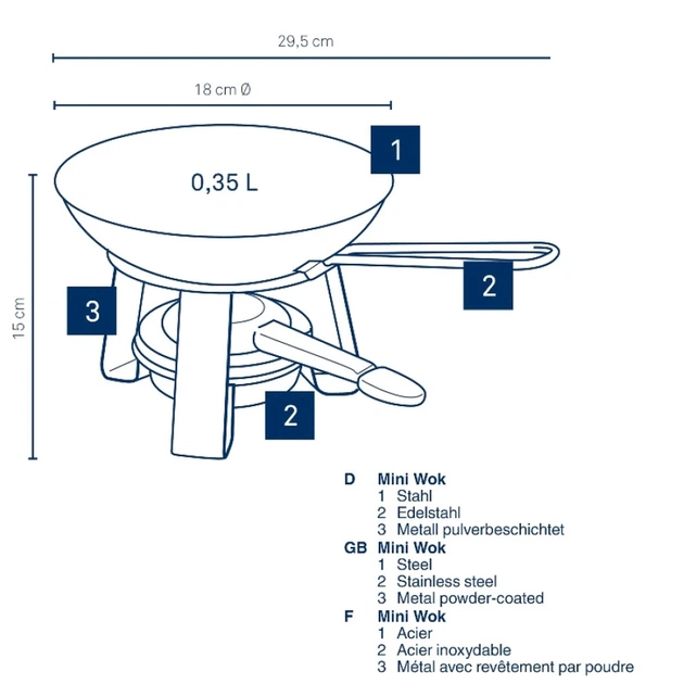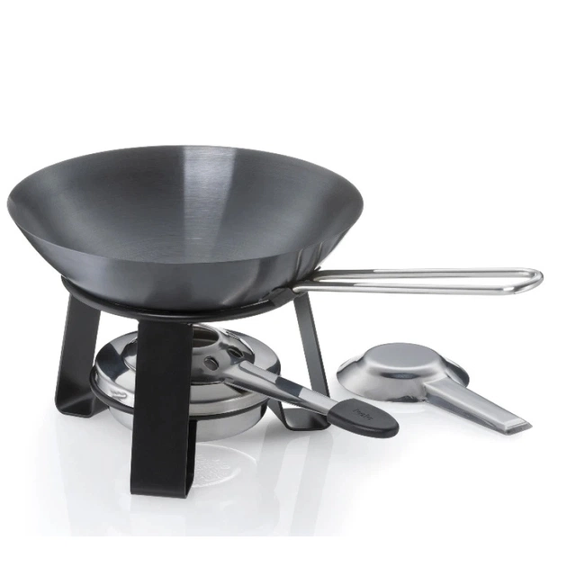 Готуйте шоколадне, сирне, м'ясне, рибне або овочеве фондю, використовуючи набір для фондю міні-вок KELA Joy. Набір для фондю KELA Joy складається з 3 предметів: мінівок діаметром 18 см зі сталі з покриттям (1 шт), підставка зі сталі (1 шт), пальник із захисною кришкою з нержавіючої сталі (1 шт).