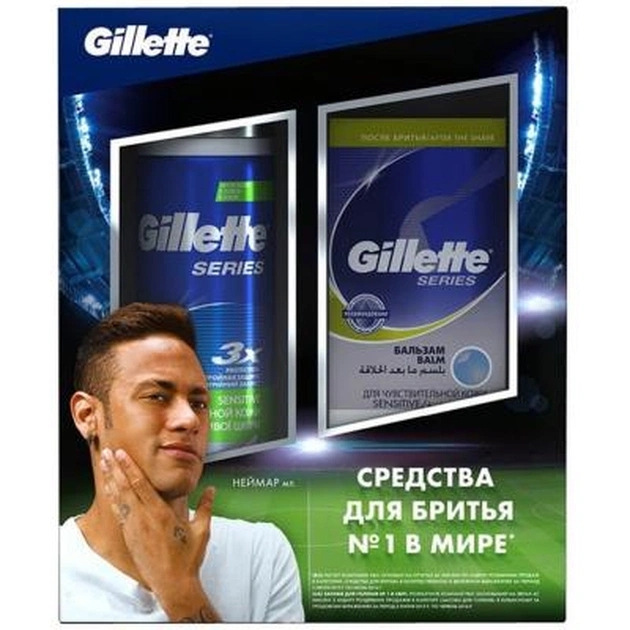В подарунковий набір Gillette Series Sensitive від бренду Gillette входить піна для гоління і бальзам, запаковані в стильну коробку.