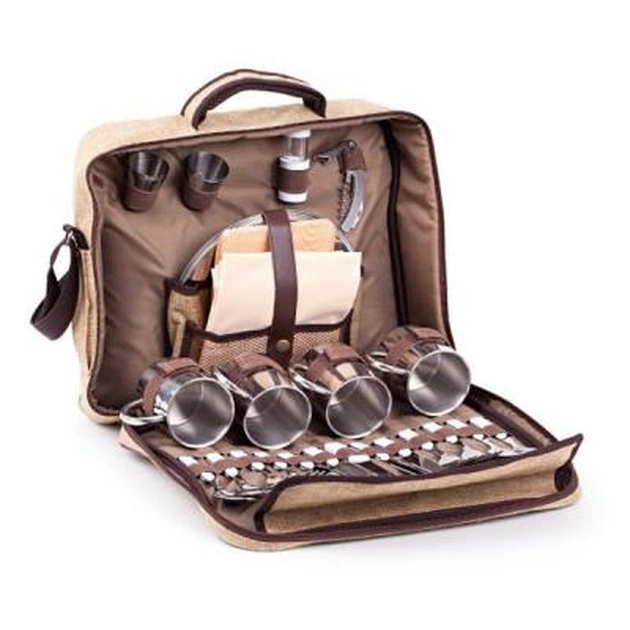 Предмети набору розраховані на 4 персони - це і стандартні столові прилади (ложки ножі і виделки), посуд, тарілки, термочашкі, чарки, а також аксесуари необхідні для організації такого заходу, скатертину, плед-килимок, серветки, відкривачка, дошка, ніж і ємності для солі і перцю. А використовувані в його виробництві матеріали настільки надійні, що набір для пікніка Кемпінг HB4-575 прослужить Вам не один сезон.
