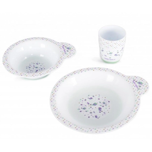 Ідеальний набір для годування малюка (тарілочка глибока, тарілочка дрібна, чашка). Всі предмети набору мають захист від ковзання. Посуд можна використовувати в мікрохвильовій печі і мити в посудомийній машині (тільки верхній рівень).