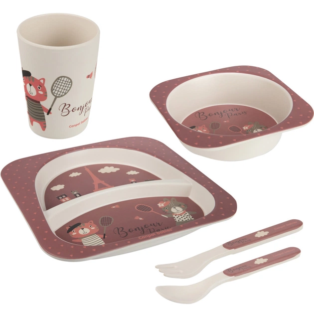 Набір посуду Canpol Babies Bonjour Paris - це екологічно чиста альтернатива класичному посуду з пластику. Набір посуду виготовлено з міцних, стійких та придатних для контакту з харчовими продуктами матеріалів з використанням натуральної сировини –50% деревного борошна і 30% харчового кукурудзяного крохмалю (і 20% меламінової смоли).