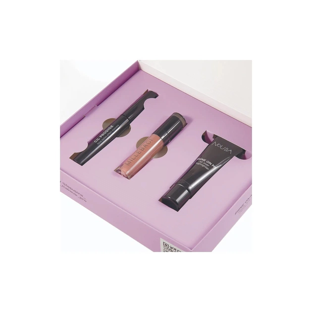 Склад набору: Туш для вій - Nouba Cil Prodige Mascara (Black), 9 мл + Стійка помада - NoUBA Millebaci (№16), 6 мл + Рідкий хайлайтер - NoUBA Shine On Me, 30 мл