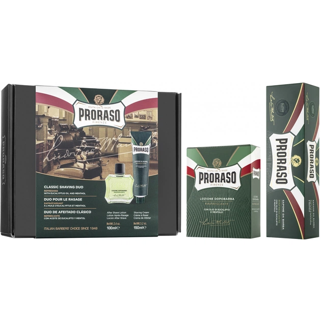 Сучасний чоловік заслуговує на догляд з Proraso Green Classic Shaving Duo! Розкішний подарунковий набір поєднує два засоби для гоління, які наповнені бадьорим, освіжальним ароматом ментолу та евкаліпту. Крем для та лосьйон після гоління Proraso Green Classic зроблять процедуру максимально комфортною, безпечною та ефективною. Продукція не містить у складі парабенів, мінеральних олій, силіконів, компонентів тваринного походження та штучних барвників.