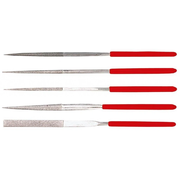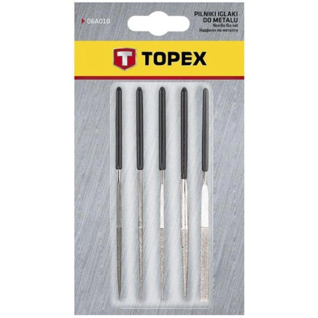 Набір надфілів Topex алмазні, 5 шт. (06A000)Набір алмазних надфілів TOPEX довжиною 140 мм і діаметром 4 мм. Призначений для вигладжування і шліфування поверхонь, заточування інструментів. Надфілі п'яти універсальних форм забезпечують всебічне застосування. Прорезиненная рукоятка. Алмазне покриття, нанесене гальванічним методом.