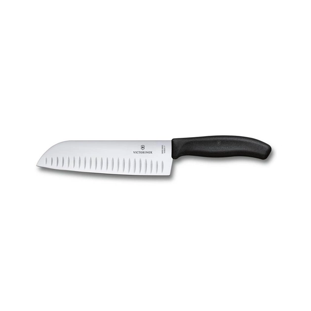 - ніж Santoku (сантоку). Широке лезо з рифленим краєм і довжиною 17 см. При нарізанні поглиблення на клинку мінімізують прилипання продуктів до леза. Косий кінчик леза ідеальний для нарізування кубиками, скибочками чи подрібнення продуктів на рівній поверхні. Чудово справляється з нарізкою м'яса, риби, овочів чи сиру. Рукоятка виконана з термопластичного еластомеру (ТЕП). Безпечно мити в посудомийній машині. Вага ножа: 140 г.