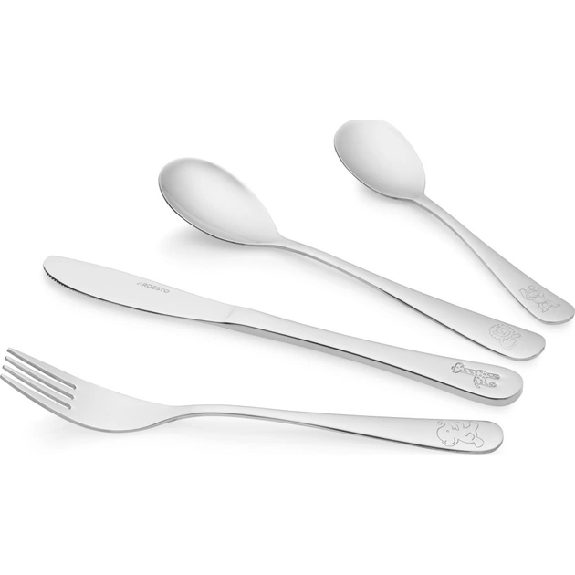 Набір дитячого столового приладдя з 4 предметів. Включає в себе: ложкe, виделкe і ніж. Приладдя виконано з нержавіючої сталі з дзеркальною поліровкою.