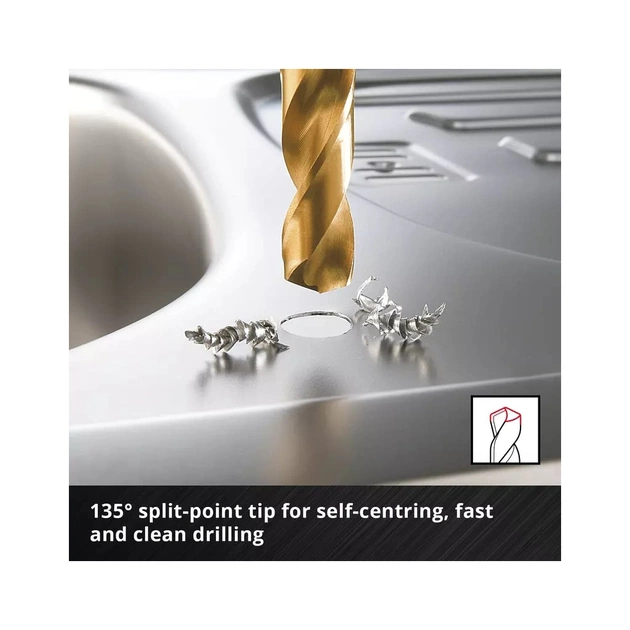 Набір свердел від Einhell, що складається з 19 шт. свердел по металу, містить свердла найпоширеніших діаметрів 1 / 1,5 / 2 / 2,5 / 3 / 3,5 / 4 / 4,5 / 5 / 5,5 / 6 / 6,5 / 7 / 7,5 / 8 / 8,5 / 9 / 9,5 / 10 мм. Свердла виготовлені з високоякісної, повністю відшліфованої швидкоріжучої сталі HSS 4341, яка відома своїми надзвичайно високими експлуатаційними характеристиками та дуже довгим терміном служби. Азотування титаном надає свердлам зі швидкоріжучої сталі підвищену твердість і зносостійкість, а також золотистий колір.