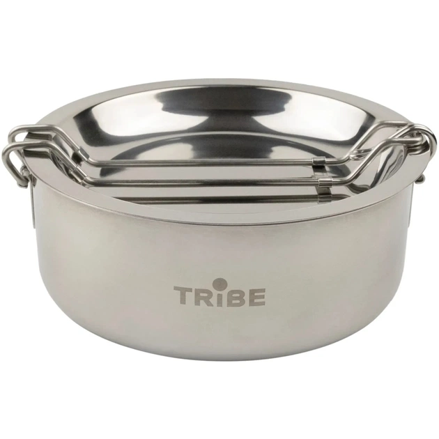 Tribe Tourist Set 1,2 л - набір посуду для походу та відпочинку на природі, виготовлено з нержавіючої харчової сталі, що дозволяє використовувати його як на вогнищі, так і на пальнику або плиті. В набір входить казанок зі складаною ручкою та тарілка-кришка. Все це компактно складається в чохол, що робить цей набір зручним для транспортування та зберігання.