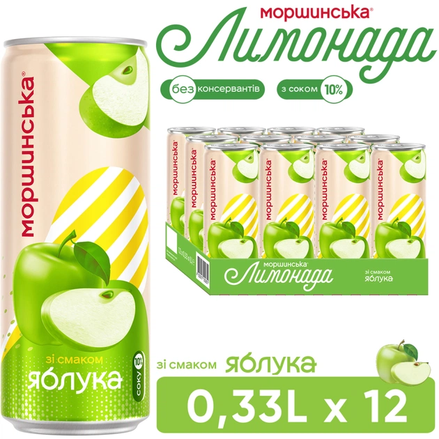 Моршинська Лимонада зі смаком яблука – на основі природної мінеральної Моршинської з додаванням 10% соку стиглих яблук.