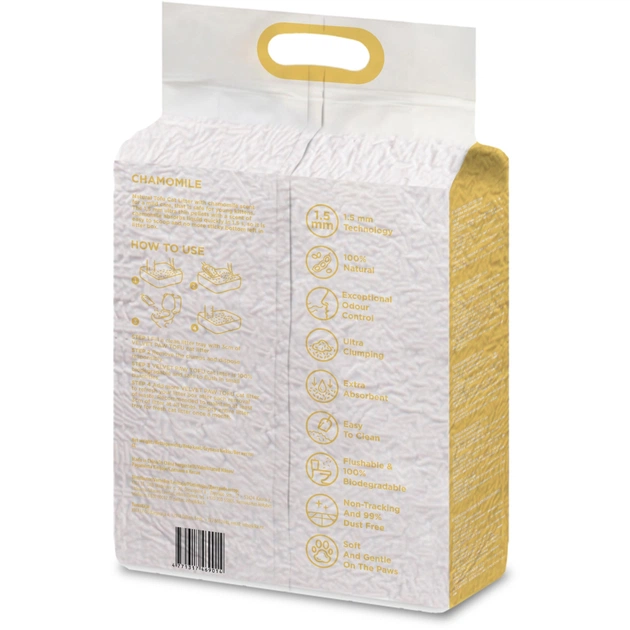 Завдяки екстракту ромашки, наповнювач для котячого туалету набагато ефективніше поглинає неприємні запахи, перешкоджає розмноженню бактерій і сам має приємний запах. Відмінно підходить для кошенят та молодих котиків.