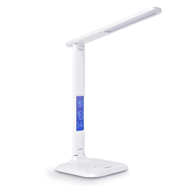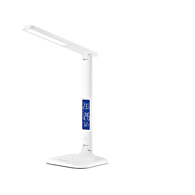 Конструкція дозволяє складати лампу навпіл, економить робоче місце днем і зручна для експлуатації та транспортування. За допомогою рухомого кріплення ви легко зможете змінити кут освітлення. Кут розсіювання світла у даній настільній лампі складає 120 градусів. LCD дисплей показує годинник, будильник, календар, термометр. Підсвічування ЖК дисплея в разі потреби можна вимкнути. Дисплей можна налаштувати за допомогою кнопок, які знаходяться на зворотному боці корпусу настільної лампи.
