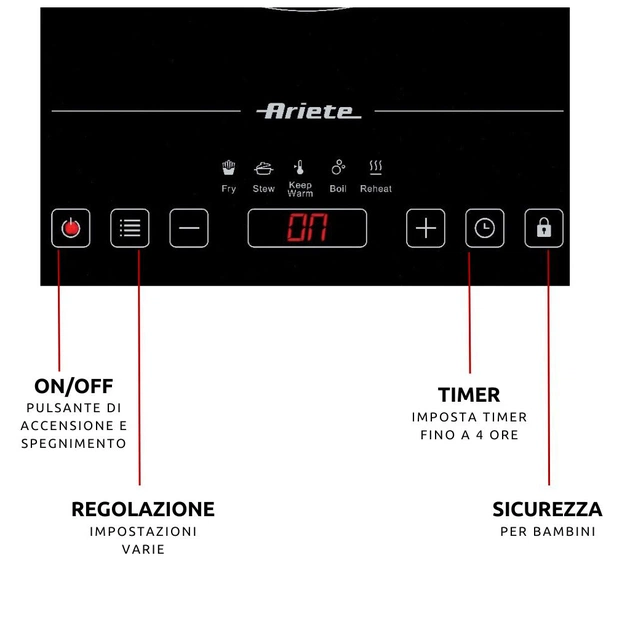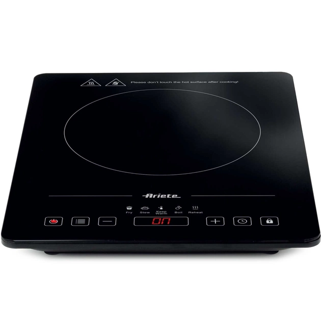 Настільна плита індукційна Ariete 1997/00 поєднує в собі елегантність склокерамічної поверхні з передовими технологіями приготування їжі. Завдяки потужності 2000 Вт, функції швидкого приготування та максимальній температурі 240˚C приготування улюблених страв стає швидким та зручним. Варильна поверхня пропонує 10 рівнів потужності та 5 попередньо встановлених програм, що дозволяє точно налаштувати параметри для різноманітних страв. Інтуїтивно зрозуміла сенсорна панель керування з функцією блокування та таймером робить приготування їжі не тільки зручним, але й безпечним. Завдяки компактним розмірам та діаметру зони приготування 28 см, плита ідеально підходить як для невеликих кухонь, так і для приготування їжі на свіжому повітрі.