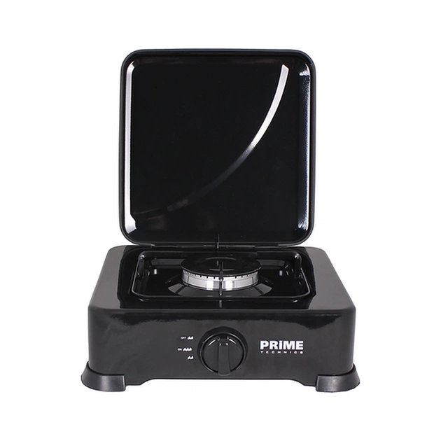 Настільна газова плитка, потужність 2200 Вт, 1 конфорка, механічне керування, поворотні перемикачі, кришка, робоча поверхня - емальована, решітка з литого алюмінію, вбудований штуцер для шланга, прогумовані ніжки