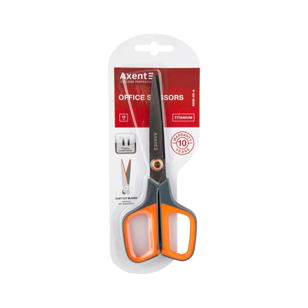 Офісні ножиці з пластиковими ручками ергономічної форми Axent Titanium. Використовуються для різання паперу, картону, тканини та ін. Якісні матеріали та збірка, продумані деталі ножиць забезпечують комфортну, безпечну роботу і довговічність. Особливість ножиць серії Axent Titanium - особлива форма лез, виготовлених з високоякісної сталі та вкриті покриттям Gun Black Titanium, що робить їх ще більш міцнішими, зносостійкими, та прослужать довше. Особлива заточка лез робить їх в три рази гостріше аналогів, а їх кінчики закруглені для безпечної роботи. Леза щільно прилягають один до одного, забезпечують плавний і м'який хід. Папір розрізається легко і без зминання. Ручки виготовлені за технологією подвійного лиття, що робить їх міцними та надійними. Зручність і комфорт у використанні, стильний дизайн. Упаковка - блістер. Офісні ножиці з пластиковими ручками ергономічної форми Axent Titanium Lite. Використовуються для різання паперу, картону, тканини та ін. Якісні матеріали та збірка, продумані деталі ножи