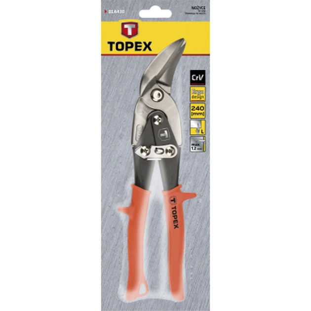 Ножиці по металу TOPEX, довжина 240 мм, служать для різання металу товщиною до 1.5 мм. Головка з хромованадієвої сталі. Гумові накладки на рукоятках мають спеціальну форму і щільно сидять, завдяки чому забезпечують стабільність і комфорт роботи. рукоятки з отворами на кінцях для підвісу інструменту. Гострі кромки губок легко і плавно ріжуть метал. Бренд TOPEX призначений для домашніх майстрів. «TOPEX» - це багатий асортимент інструментів і технічних засобів у популярному класі, призначений для професійного використання і побутових потреб.