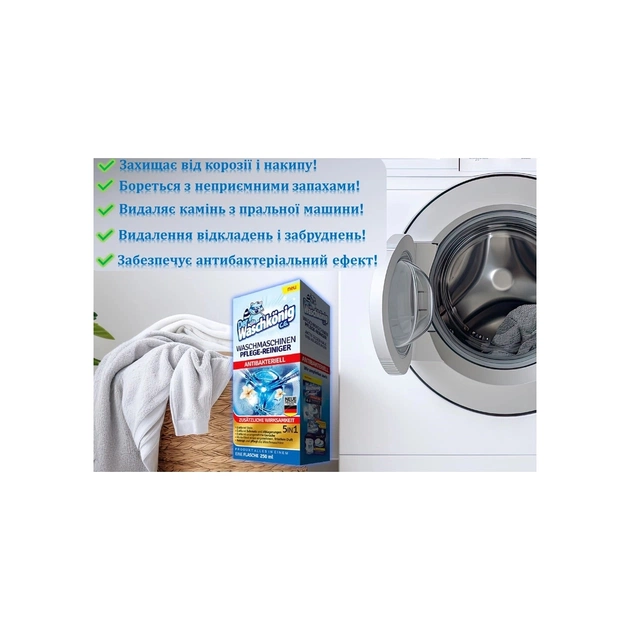 Використовуйте продукт у порожній пральній машині: очистіть бак для миючого засобу. Залийте засіб у бак для миючого засобу. Встановіть пральну машину на 60 хв та 40 °C. Умовою ефективності очищувача є наявність відповідних параметрів, тобто температури, часу використання та дозування.