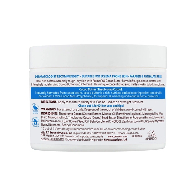 Формула масла збагачена вітаміном Е, відомим своїми антиоксидантними властивостями. Вона ідеально підходить для догляду за сухою і схильною до екземи шкірою, має потужні пом'якшувальні властивості. Масло какао забезпечує зволожувальний ефект. Регулярне застосування дає змогу підвищити пружність і еластичність.