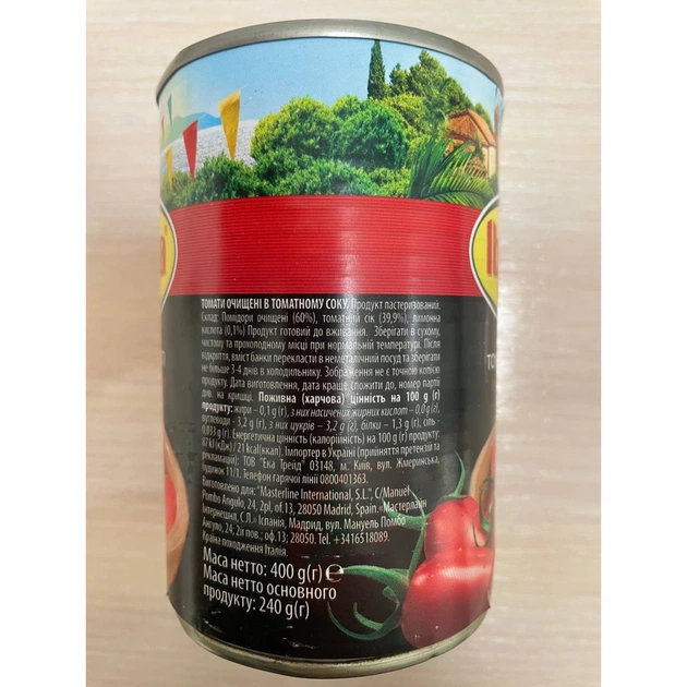 Овочева консервація Iberica Цілі очищені томати у томатному соку 400 г (8435761500025)